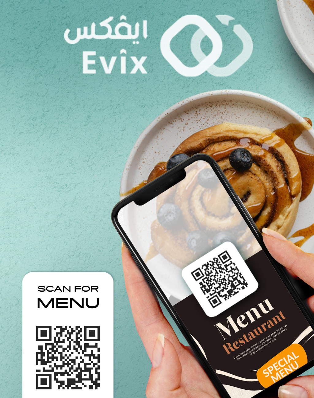 نظام إيفكس نظام سهل و متطوير يتيح لك تحويل قائمة مطعمك إلى قائمة إلكترونية تستطيع تحديثها و التعديل عليها بكل سهولة ويسر , كما يمكن للعملاء عرض القائمة من مسح رمز كيو أر كود موجود على الطاولة الخاص بالعميل و إستعراضها و الطلب من خلال جوال العميل و متابعة تجهيز طلبك بكل سهولة ويسر